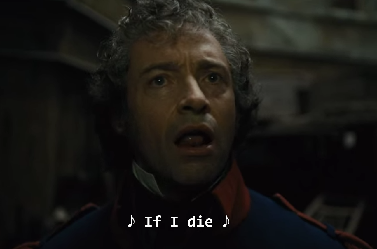 쟈베르는 자신이 끝까지 괴롭히던 장발장의 행동에 대한 생각에 그간 괴롭힌 죄수들과 가난한 이들을 차별했던 지난 과거를 후회하며 투신합니다.