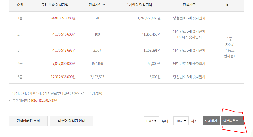1042회 당첨결과 (2022년 11월 19일 추첨) 당첨번호 5 14 15 23 34 43 1042회 순위별 등위별 총 당첨금액, 당첨게임 수, 1게임당 당첨금액, 당첨기준, 비고 안내 순위 등위별 총 당첨금액 당첨게임 수 1게임