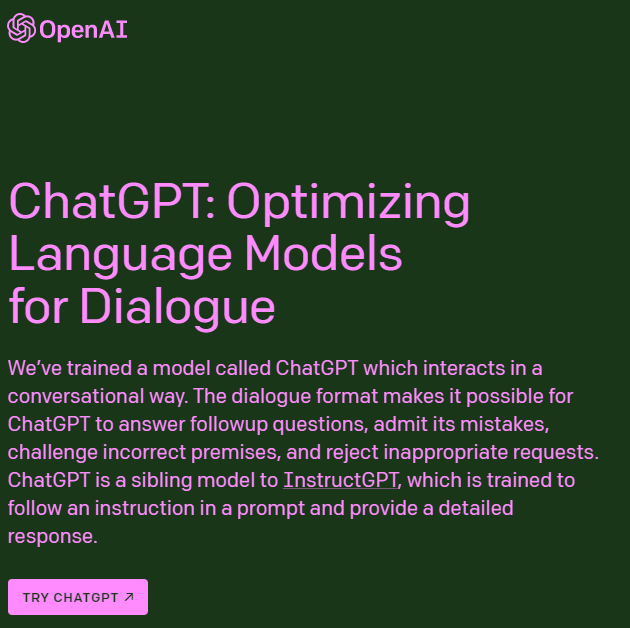 We’ve trained a model called ChatGPT which interacts in a conversational way. The dialogue format makes it possible for ChatGPT to answer followup questions, admit its mistakes, challenge incorrect premises, and reject inappropriate requests. ChatGPT is